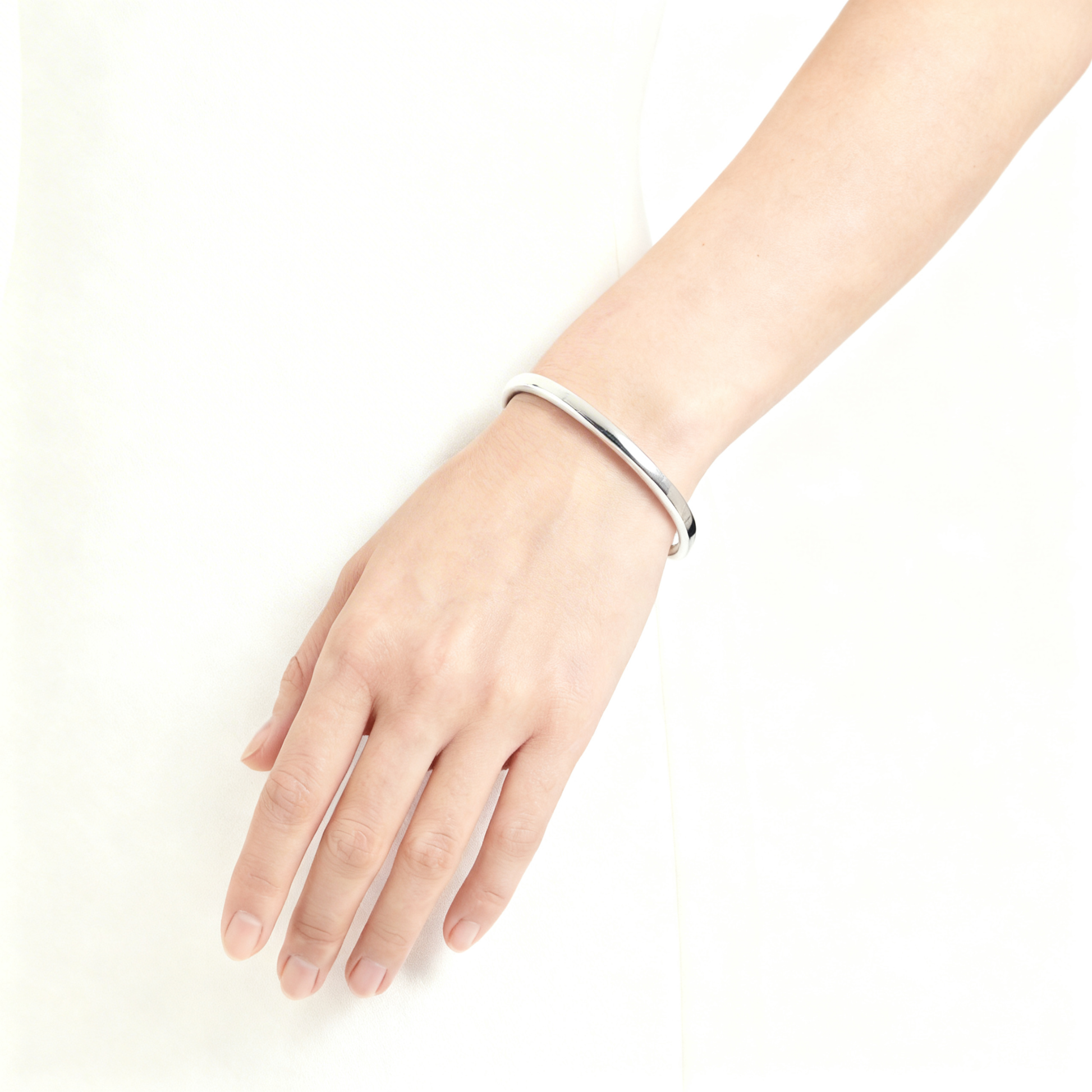余白のあるツヤを、一本に。このバングルはSV925の鏡面仕上げ。光を強く跳ね返すのではなく、丸みのあるラインでやわらかく受け止めます。だから主張しすぎないのに、手首だけがすっと整って見える。