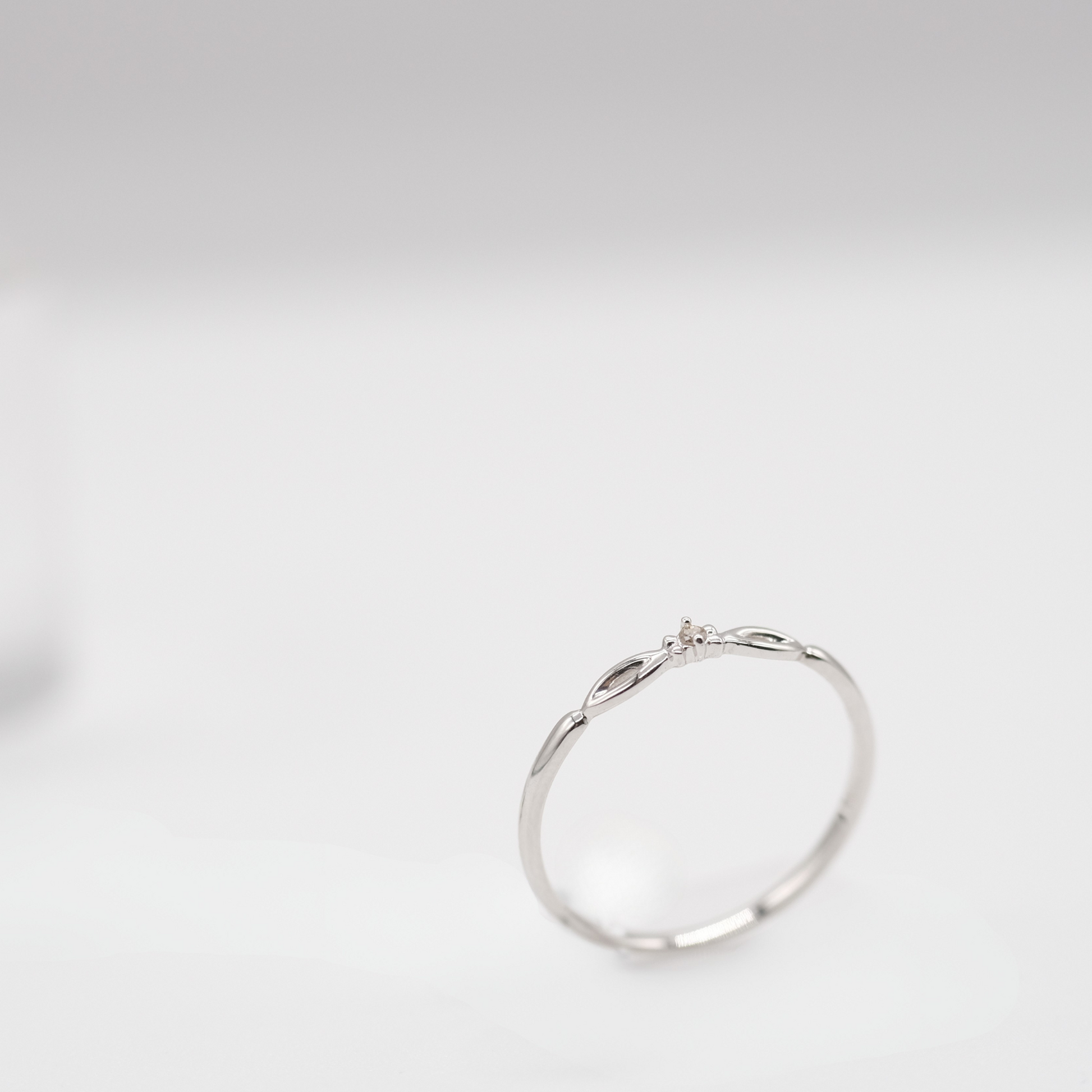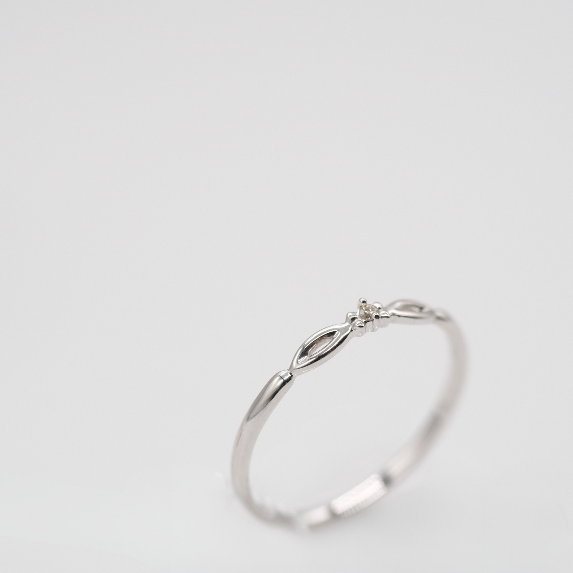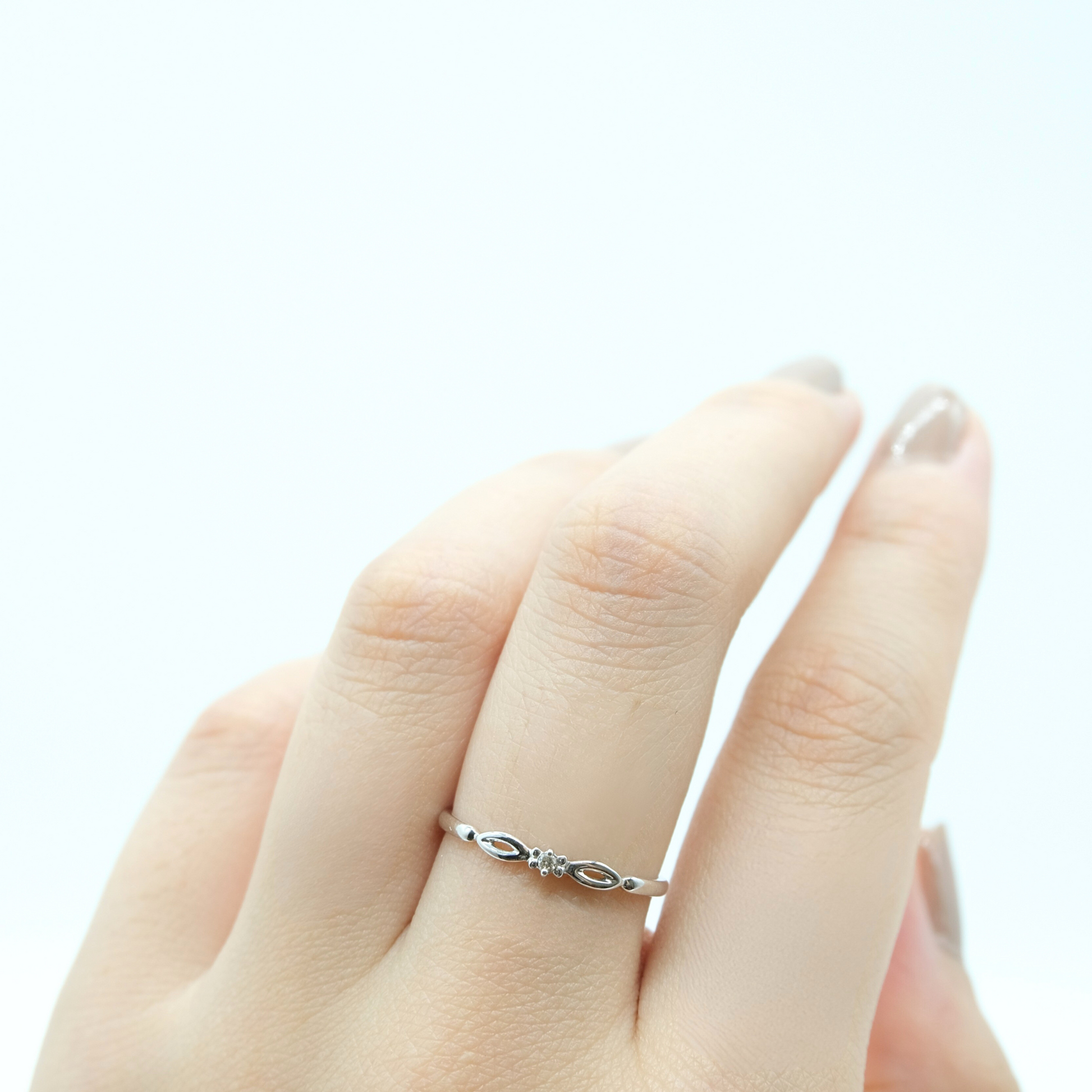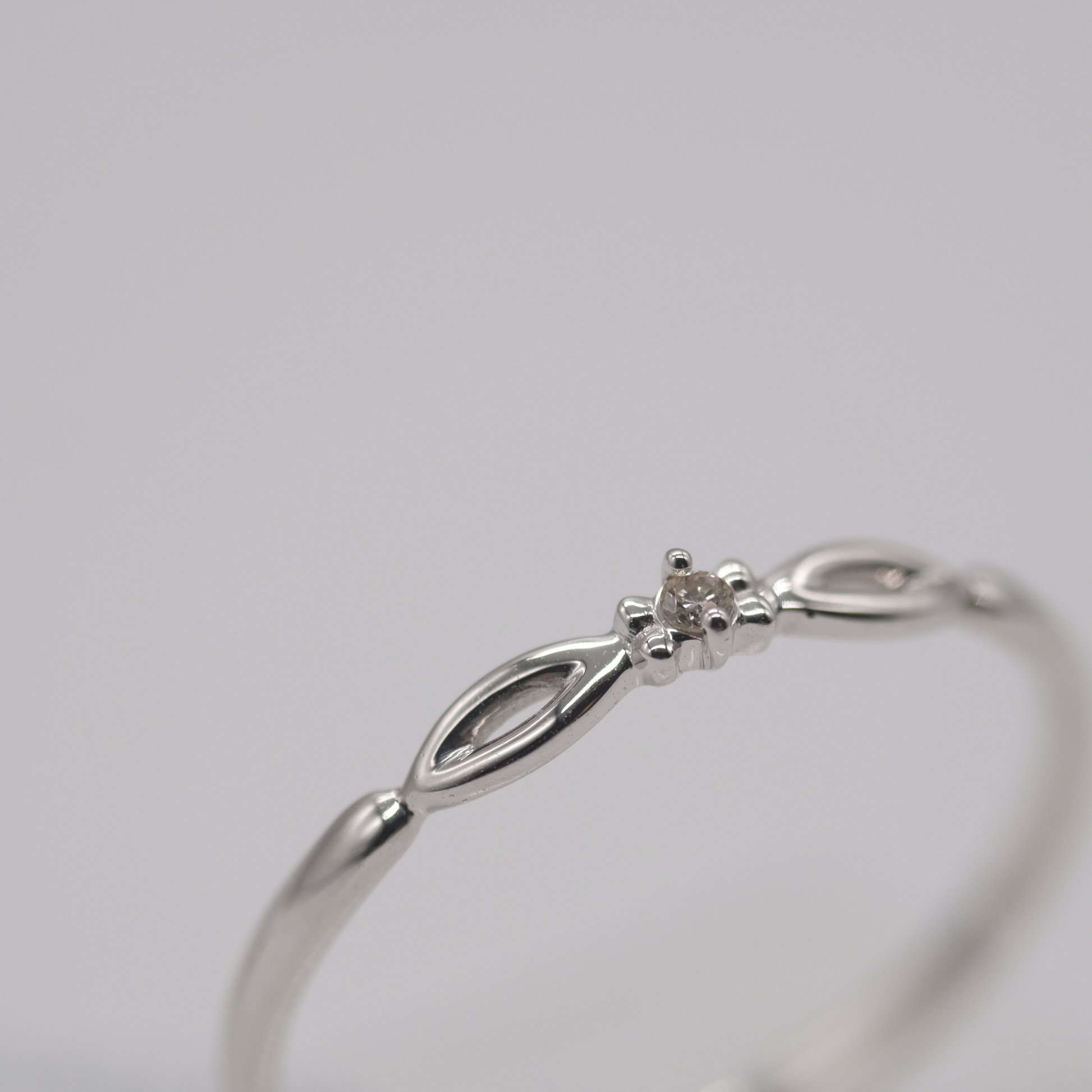 中央には小さなダイヤモンドがそっと寄り添い、K10ホワイトゴールドの艶とともに、控えめながらも確かな輝きを放ちます。