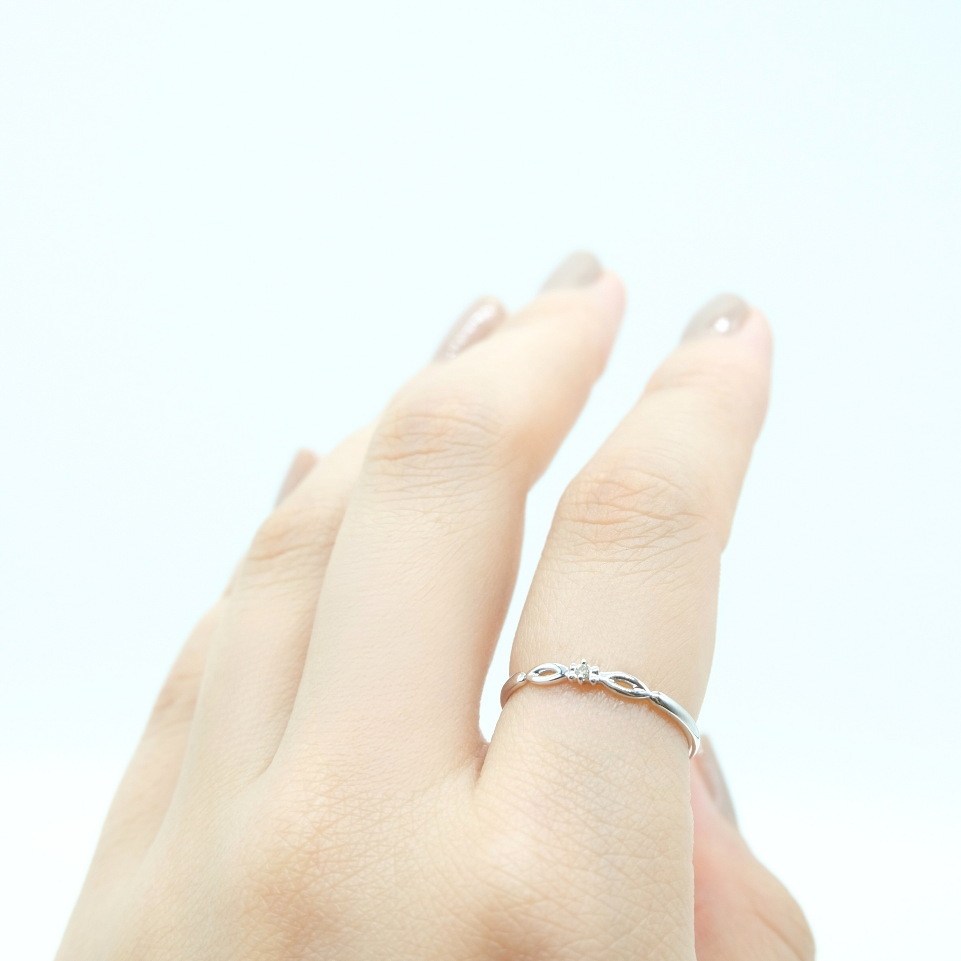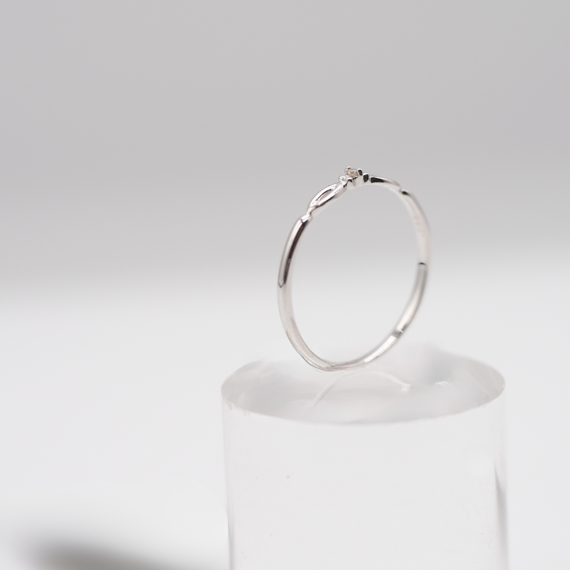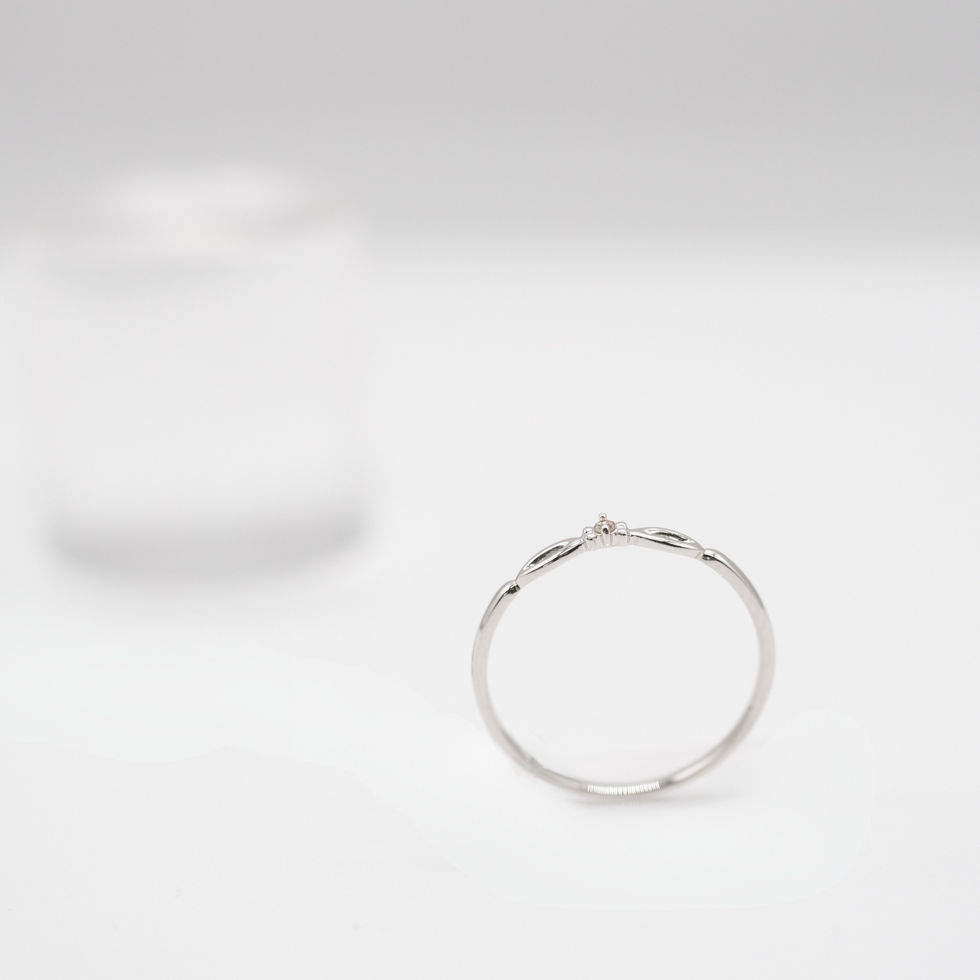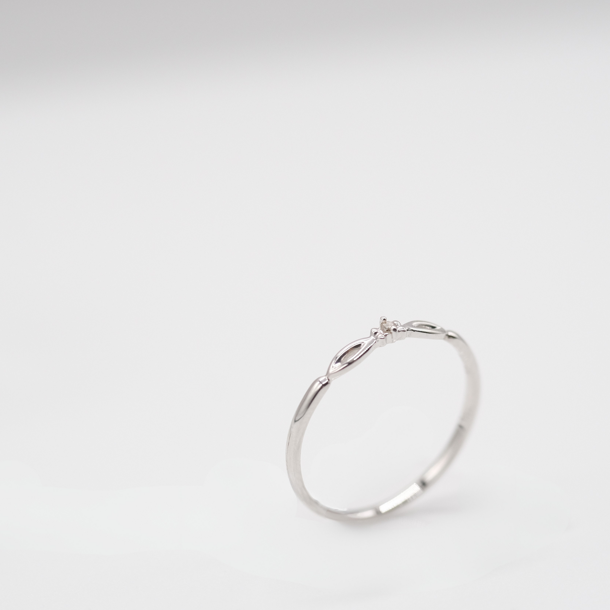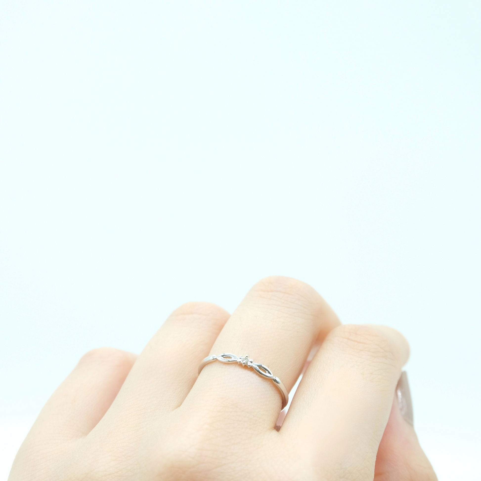 中央には小さなダイヤモンドがそっと寄り添い、K10ホワイトゴールドの艶とともに、控えめながらも確かな輝きを放ちます。