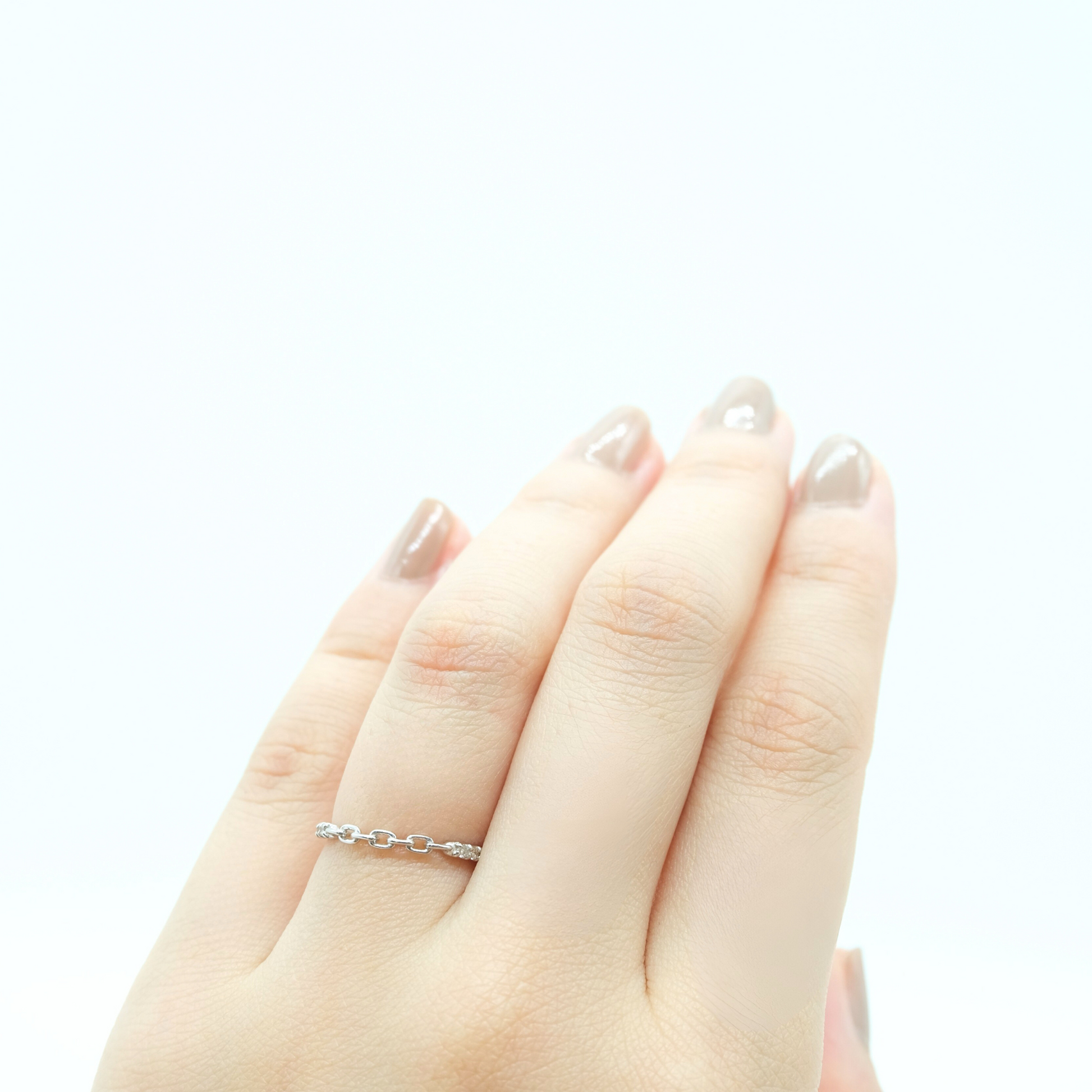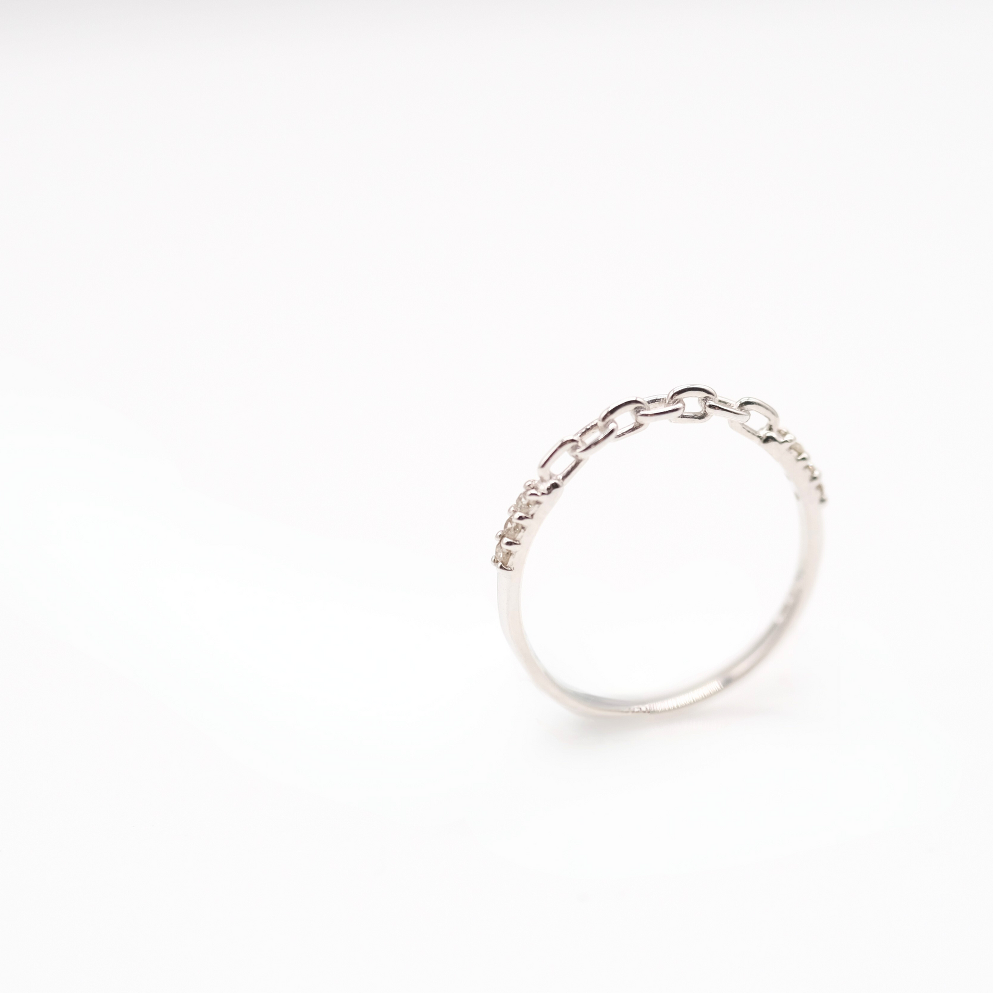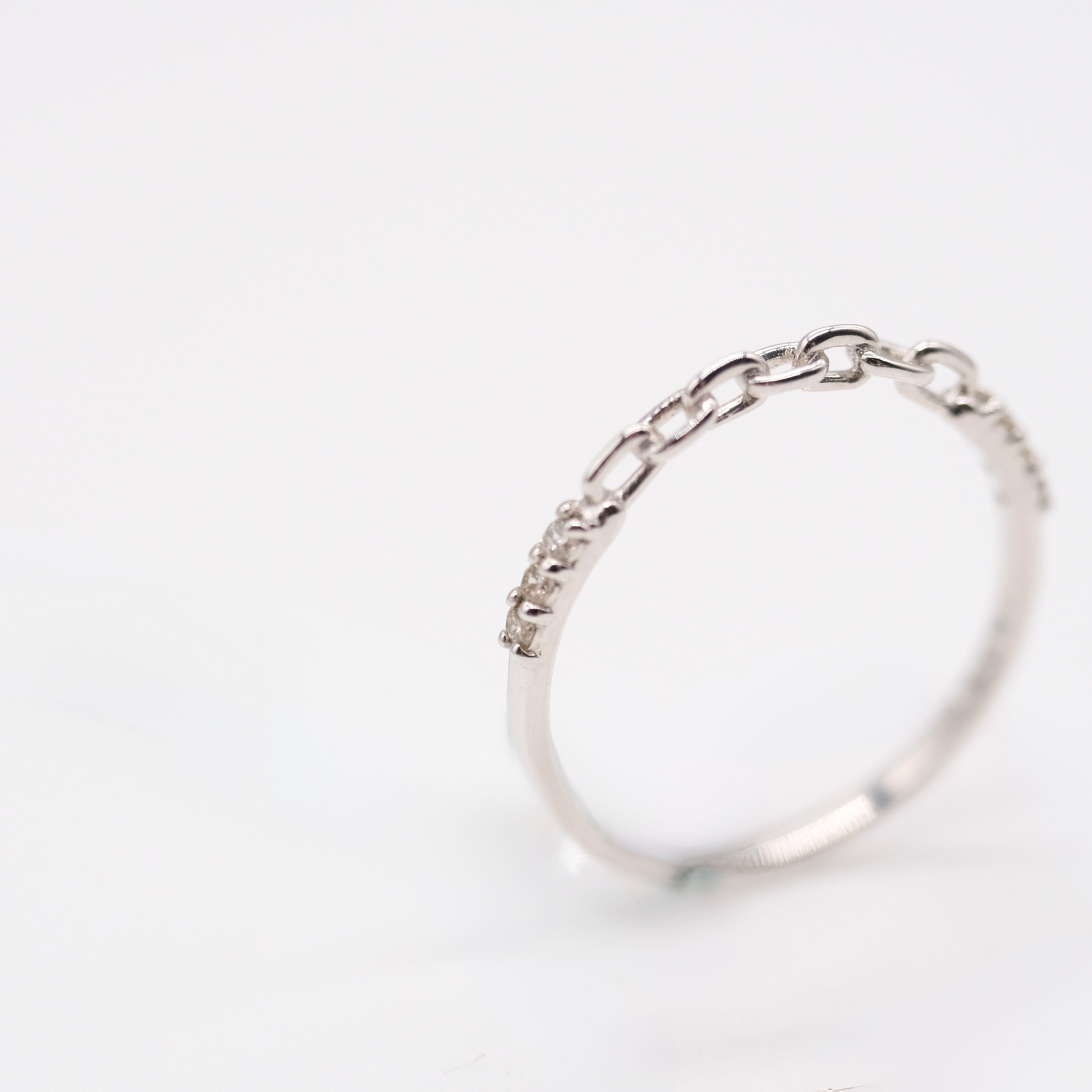 繊細なチェーン状モチーフに小さなダイヤモンドを添えた、ミニマルで洗練されたK10ホワイトゴールドのリング。