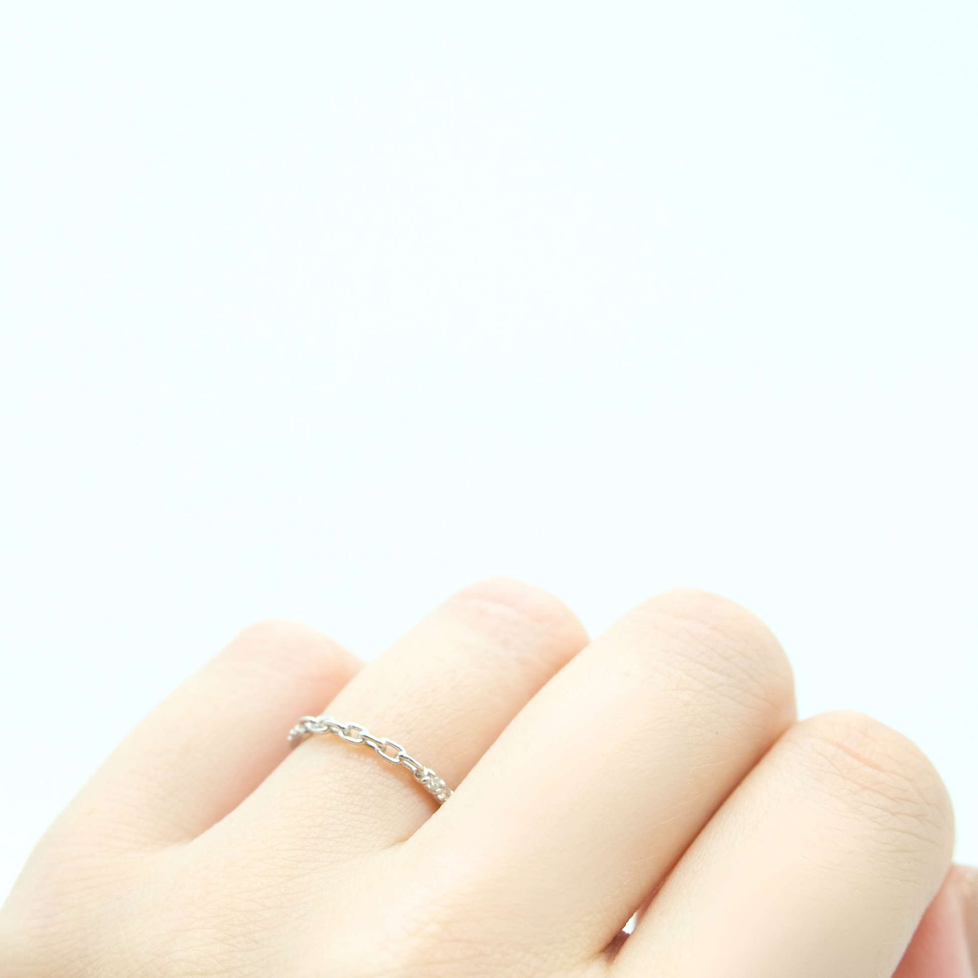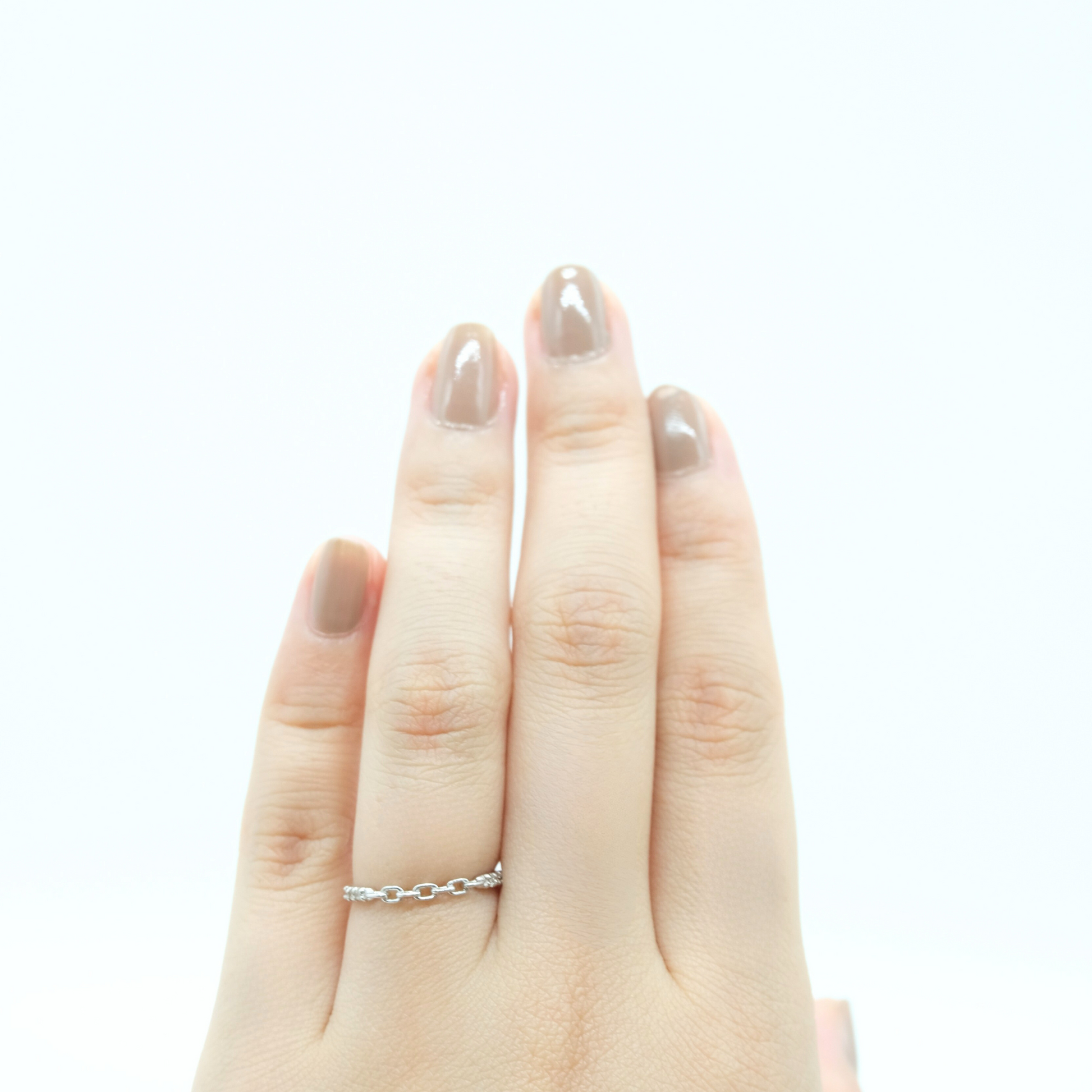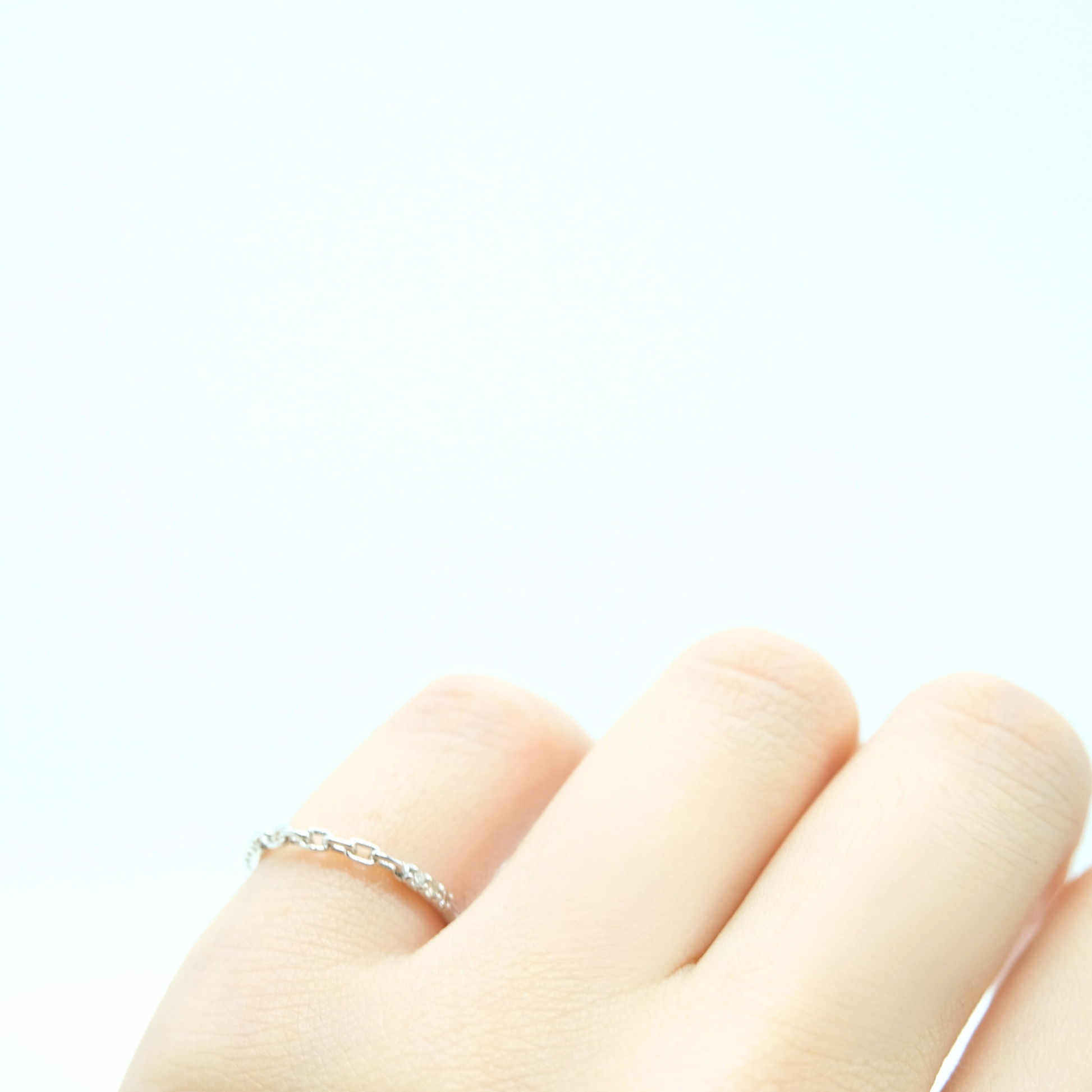 繊細なチェーン状モチーフに小さなダイヤモンドを添えた、ミニマルで洗練されたK10ホワイトゴールドのリング。