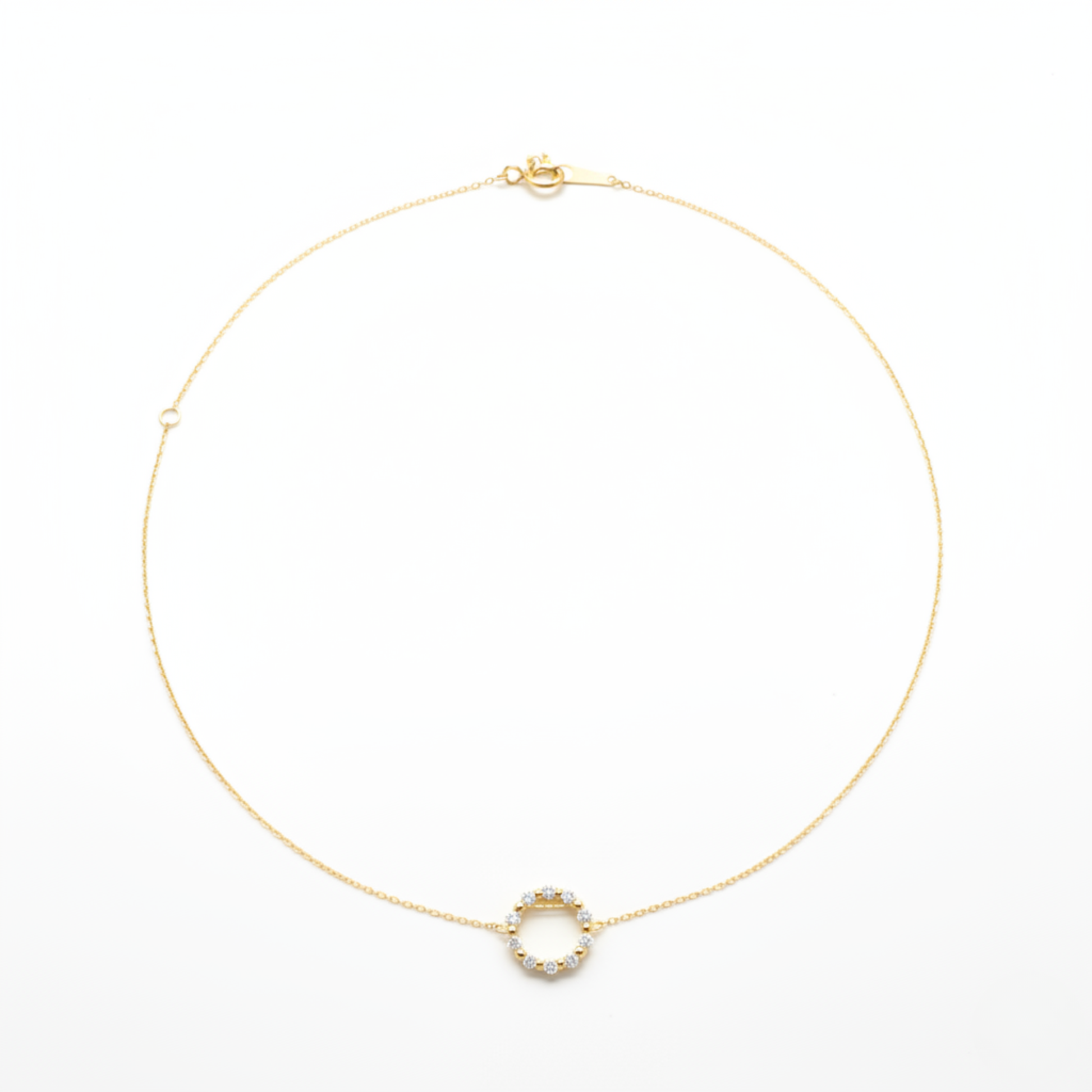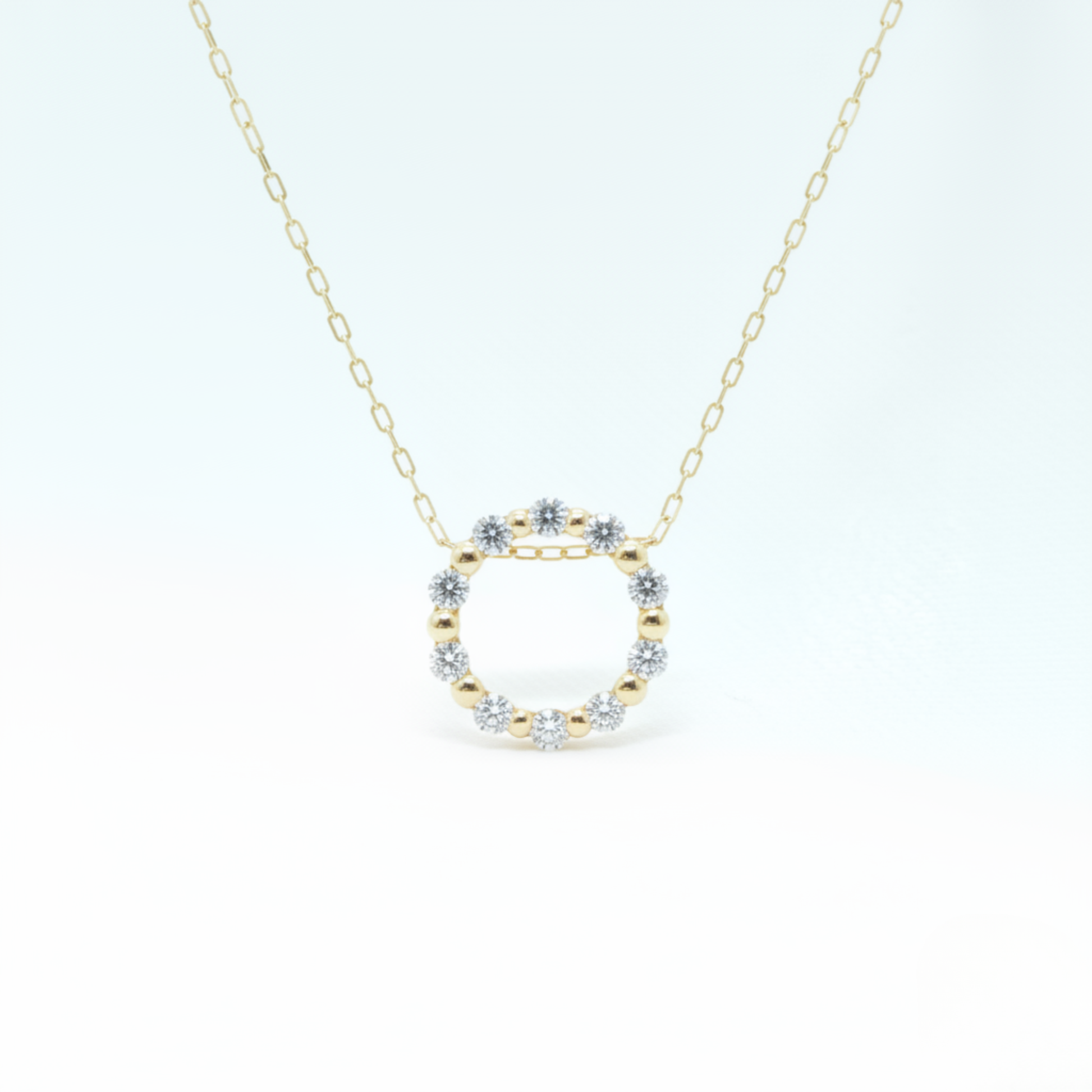 シンプルなラウンドモチーフに、0.10カラットのダイヤモンドがさりげなく輝くネックレス。