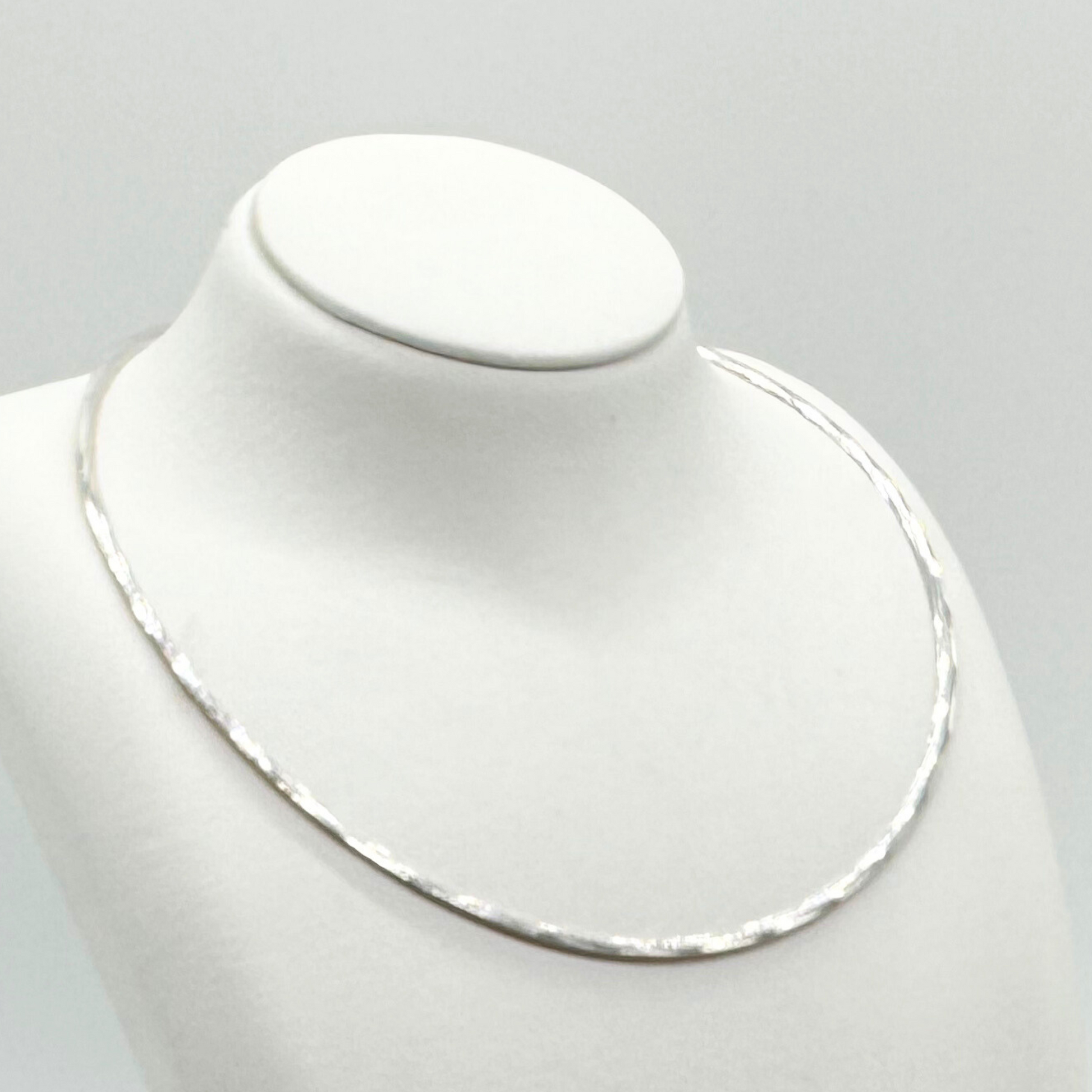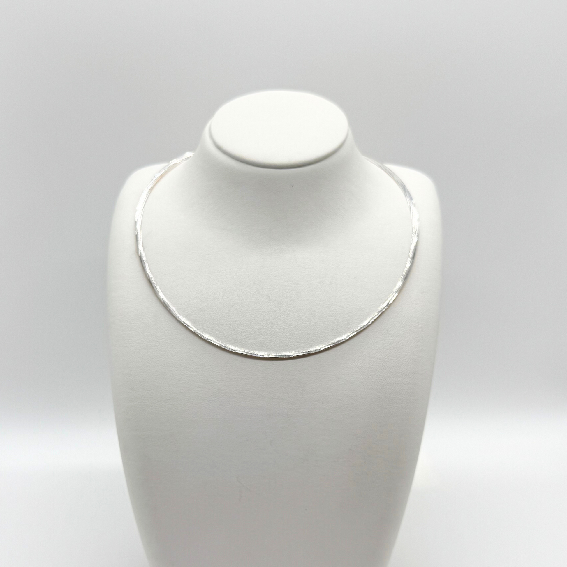 一本でも存在感の出るほどよいボリュームで、華奢なチェーンとのレイヤードにも好相性。しなやかに可動するチェーンが首もとにぴたりとフィットし、長時間でもストレスの少ない着け心地を叶えます。視線を邪魔しないミニマルな留め具は後ろ姿まで端正に整え、澄んだ光を湛える鏡面の艶が、装いを選ばず凛とした印象を添えます。