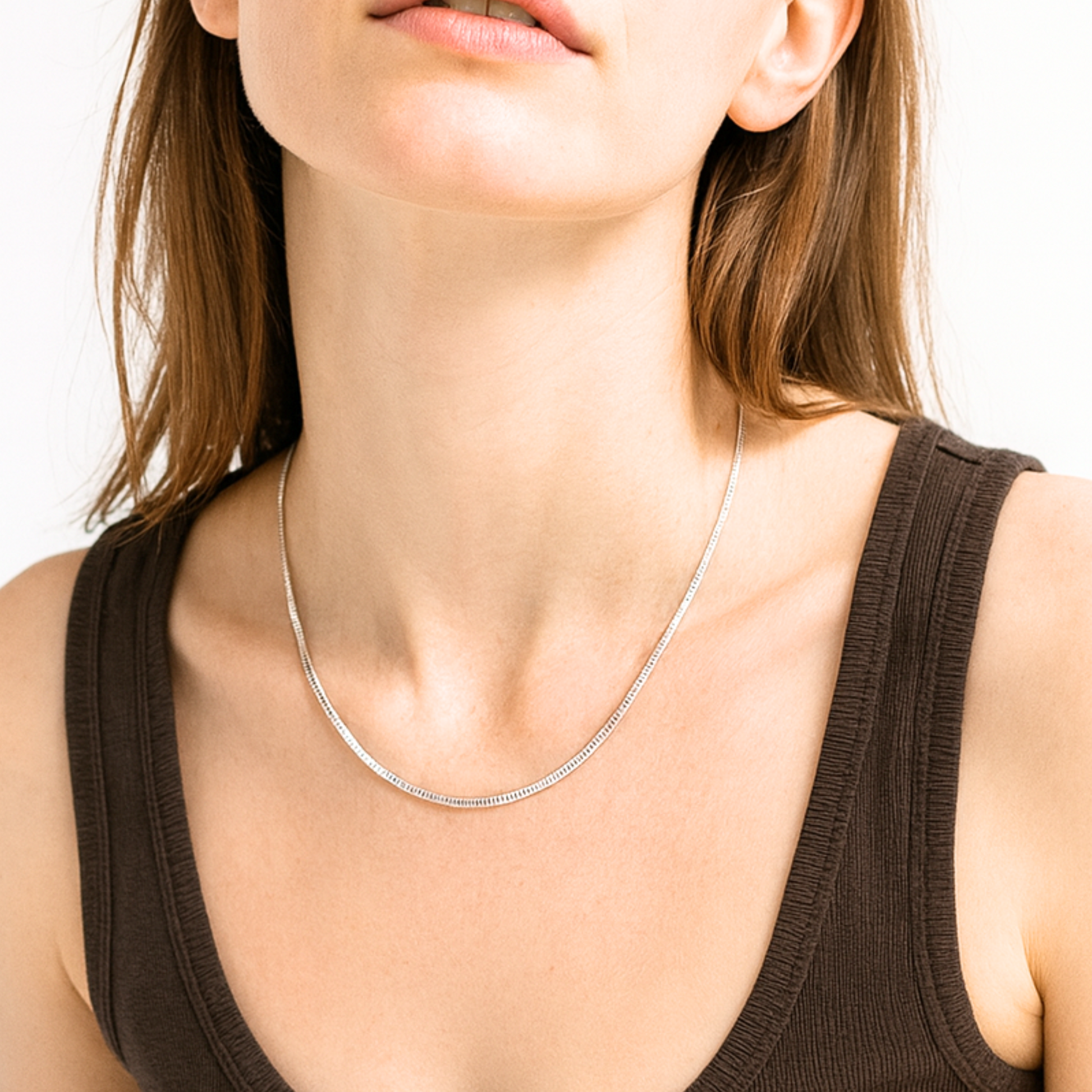肌の上をすべる光が静かに存在感を放ち、太めのヘリンボーンが液体のような艶で首もとにしっとりと寄り添います。面の一枚一枚がなめらかに連なり、角度が変わるたびに表情を変える反射が「私らしさ」をやわらかく引き立てる——Cileaのコンセプト〈日常に溶け込み、いつどんなときでも調和する、シンプルだけど可憐〉をそのまま形にした一本です。