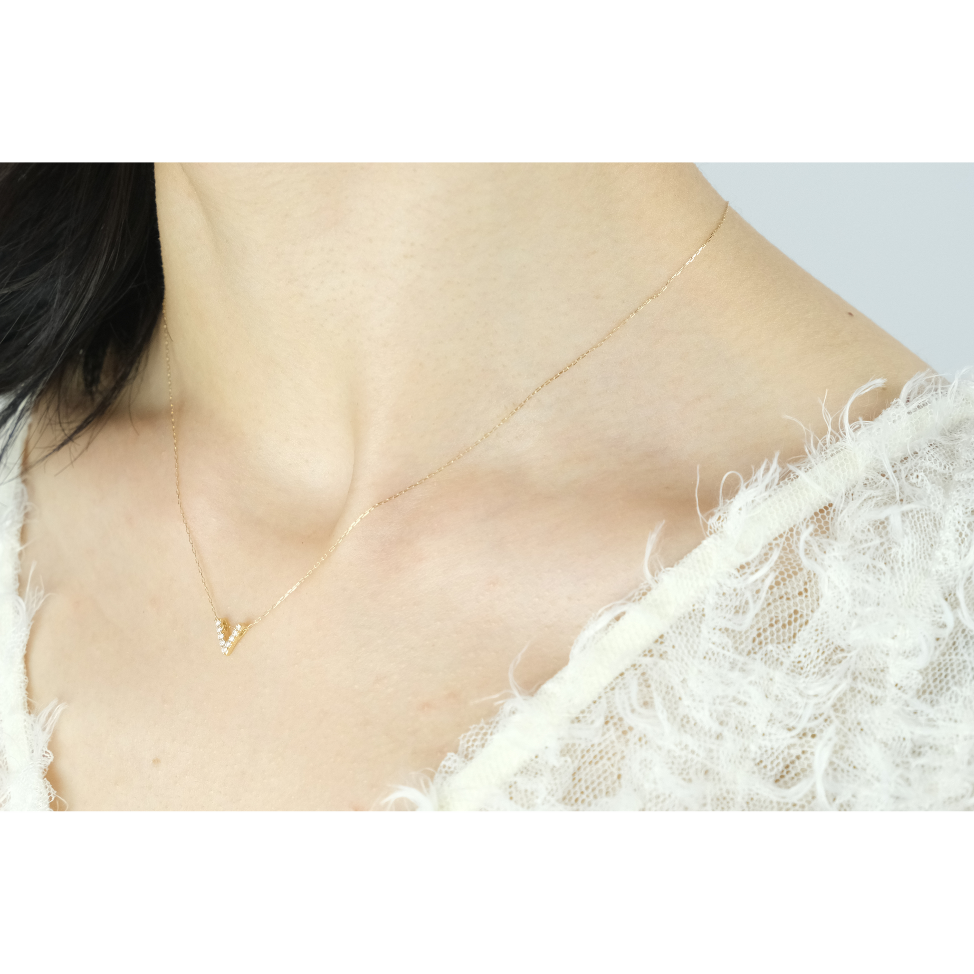 V字のラインがとてもきれいで、首元をすっきり見せてくれます。華やかすぎず、でも確かな存在感があり、毎日のコーディネートに自然になじみます。